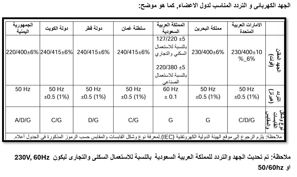 ملاحظة: تم تحديث الجهد والتردد للمملكة العربية السعودية بالنسبة للاستعمال السكنى والتجارى ليكون 230V, 60Hz او 50/60hz