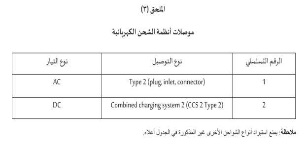 لضمان سلامة وكفاءة المركبات الكهربائيه، تتطلب اللائحة الفنية الالتزام بموصلات انظمه الشحن الكهربائيه و تشمل: